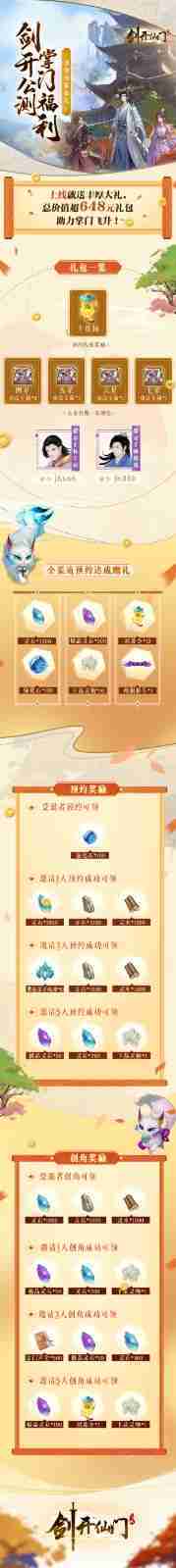 游戏为大家准备了海量的福利,,包括上线即可获得的全渠道预约礼包、、十连抽等福利,,,输入密令“JK666”、、、“JK888”即可领取紫色弟子,,,,达到金丹期后还有功法宝箱可领,,,,助力全宗上下实力提升……所有奖励总价值超过648元,,,,而邀请好友一起体验,,,,更可以获得额外的奖励哦~