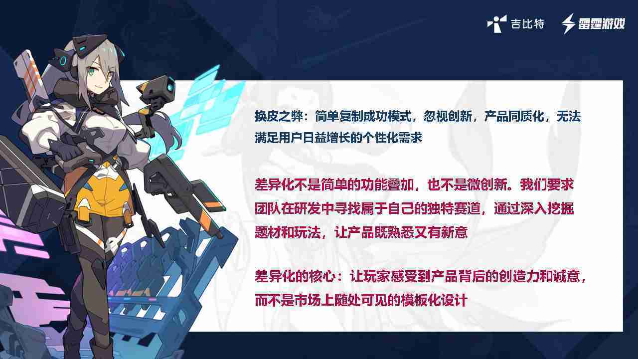 在我们内部是这么定义差异化的。。。首先,,,差异化不是简单的功能叠加,,更不是换皮。。。。只是换皮,,,,产品无法提供有效的市场价值。。。内部经常说差异化的产品不是为了迎合市场,,,,而是找到一个自己独特的表达方式,,,,在研发中找到属于自己的细分赛道和独特赛道,,,,前提是需要对这个题材有足够的深入、、、、挖掘,,,,对玩法有足够深入的理解,,,,让产品看起来既熟悉又有新意。。