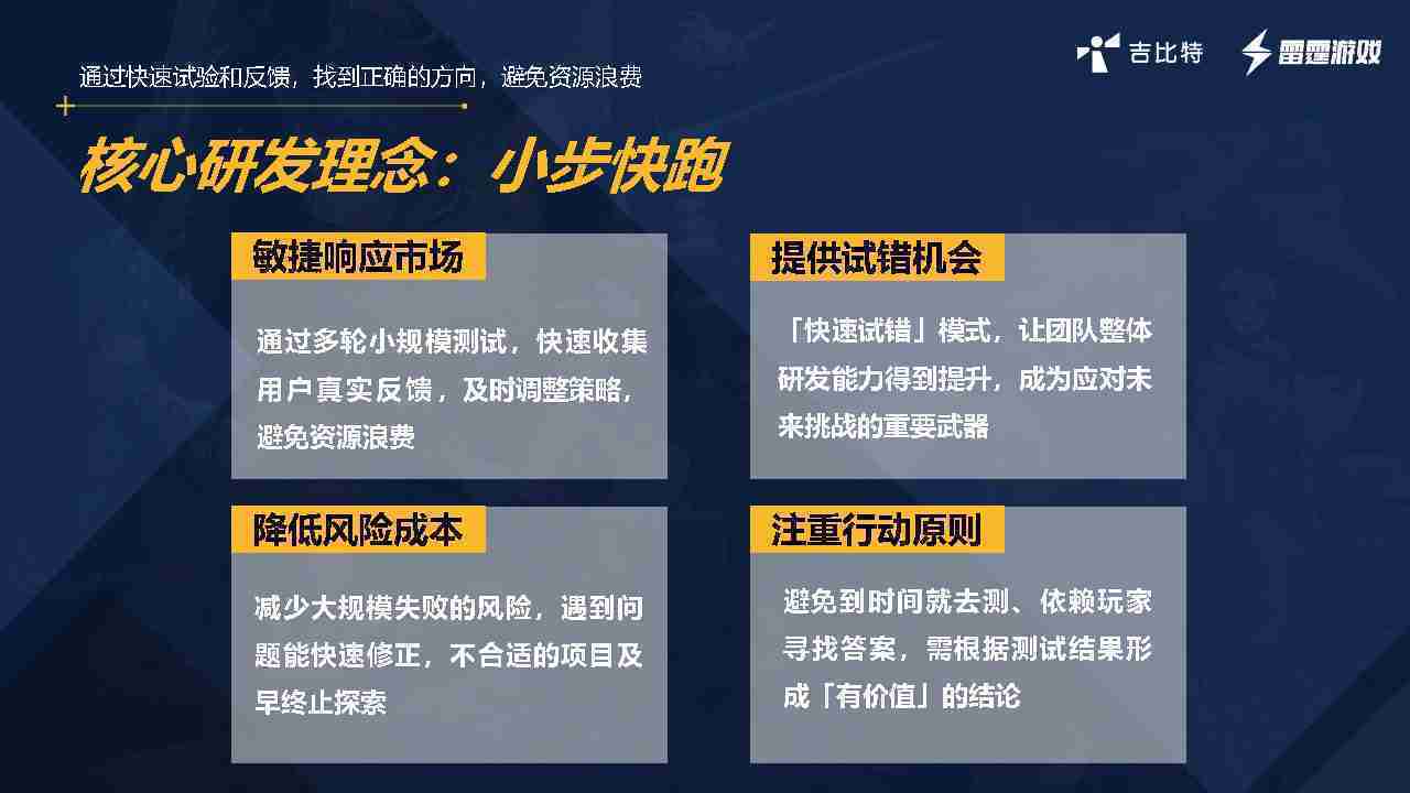 小步快跑不是找答案,,而是验证答案。。。我们之前有项目是这样的,,有些制作人会有几个方向觉得都可以做,,,,但是不确定做哪一个,,,,会选择几个都做,,,做完拿到市场跑,,跑出哪一个更好,,基于这个再做后续的研发和拓展。。。但这种情况最容易出现一个问题,,可能被玩家裹胁,,,玩家说这个点不错、、、那个点不错,,,到底听还是不听,,,不听感觉是无视玩家的反馈,,听的话,,,可能自己没想清楚导致研发思路发生偏颇。。。。所以针对这一点后面自己复盘整理,,,发现制作人自己心里要有数,,,要做自己觉得好玩的,,而且明确知道这个东西是你想做的,,,然后拿到市场验证这个答案是不是对的,,而不是拿一堆答案找哪一个答案更好。。