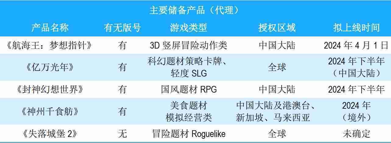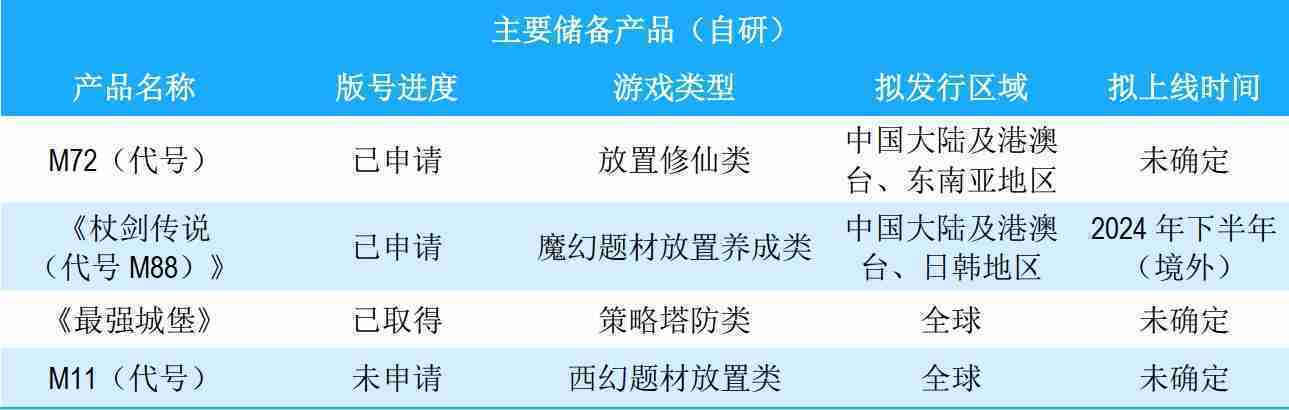 公司储备的多个自研、、、、代理产品都在有序推进当中,,涵盖放置类、、、策略类、、模拟经营类、、、RPG、、、、Roguelike等多元化游戏品类,,,储备的主要自研和代理产品如下:::