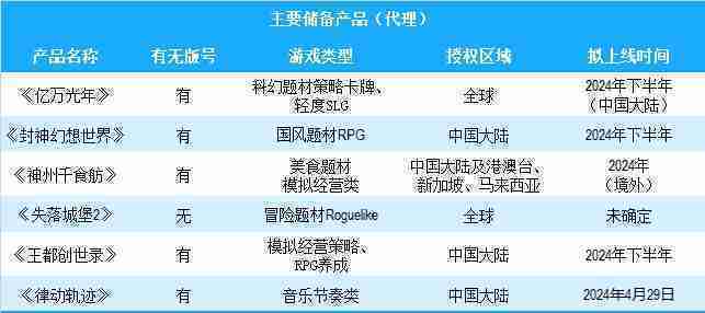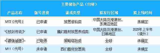 公司有多款储备产品,,涵盖放置类、、策略类、、、、RPG、、Roguelike等多元化游戏品类,,,,储备的主要自研和代理产品如下::::